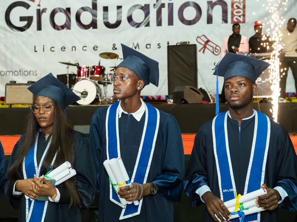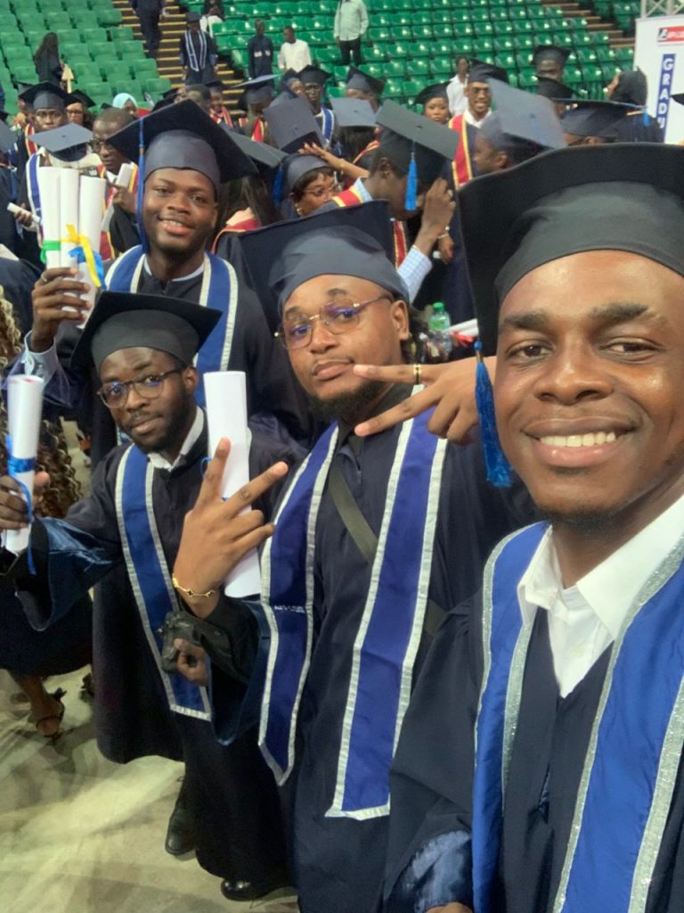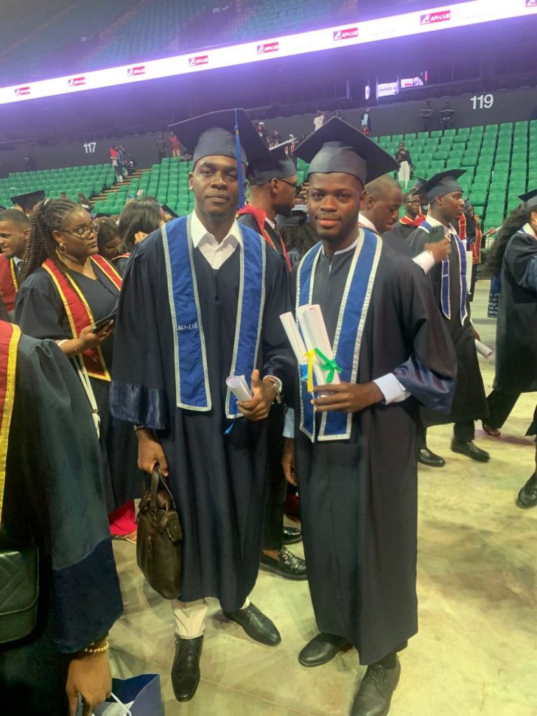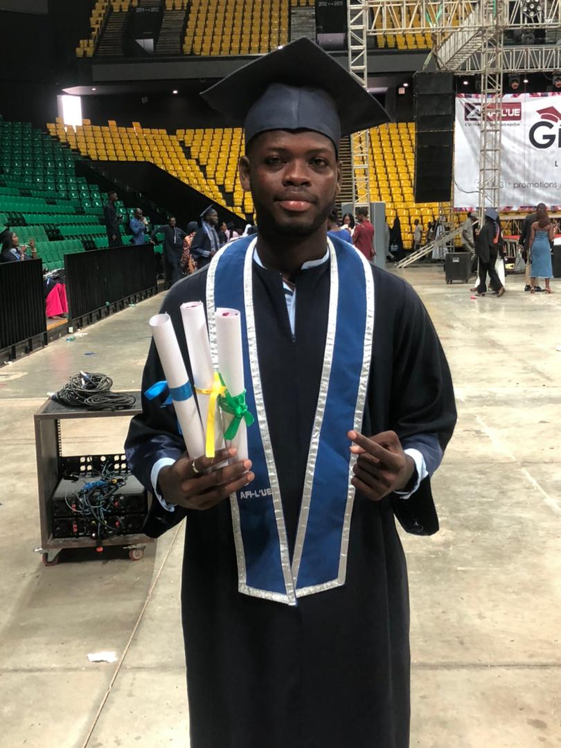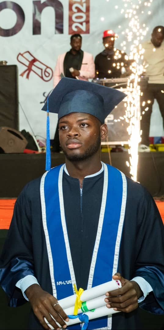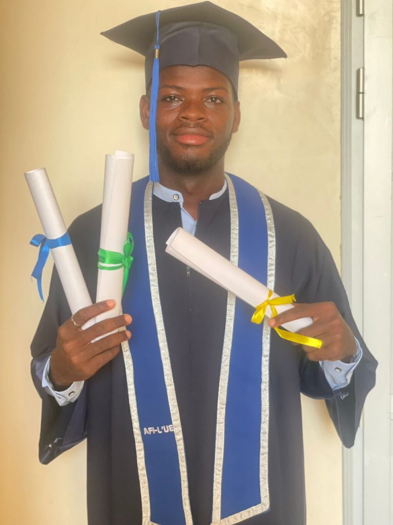 Hier sehen wir unseren Desmond, der in Dakar, Senegal, auf Französisch studiert hat. Er war gemeinsam mit Elijah dort – leider hat Elijah den Abschluss bisher nicht geschafft. Aber Desmond hat es geschafft: Er hat jetzt seinen Bachelor in International Business Management bestanden – auf Französisch, und zusätzlich auch etwas Spanisch gelernt.
